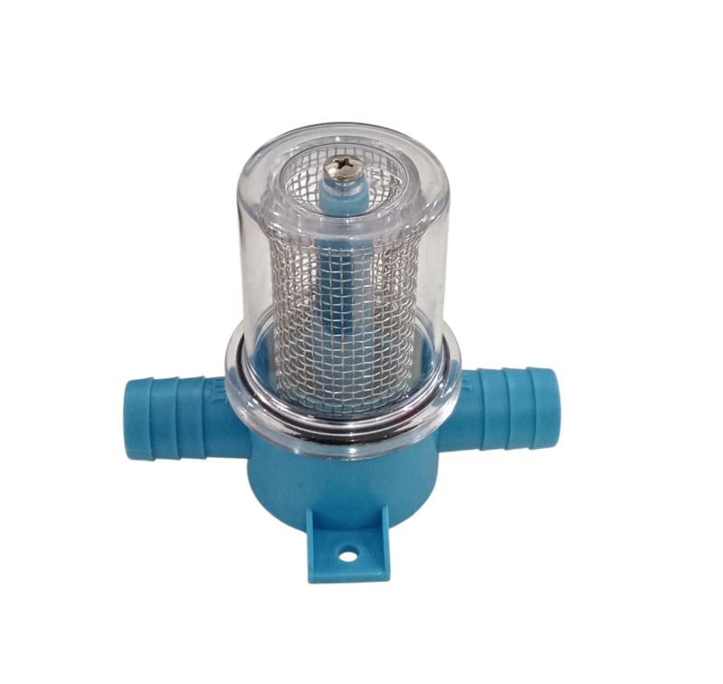 Lente transparente removível para facilitar a limpeza e a troca do filtro. O filtro é intercambiável com o Par Jabsco. O filtro deve ser montado acima da linha de nível de água e no lado de sucção da bomba.