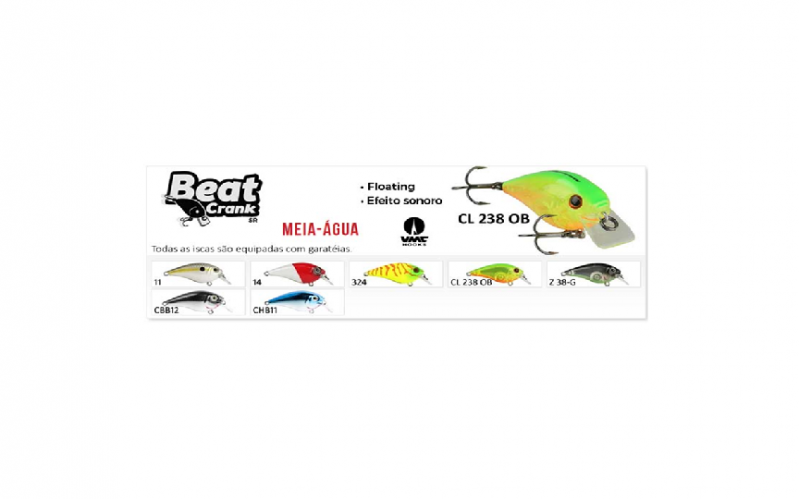 Ideal para a pescaria de Tucunaré amarelo, Pacu, Robalo, Traira, Tilápia, Black bass e entre outros. Com dimensões de 4,5 cm e peso de 6,8 g, as iscas Beat Crank estão equipadas com garateias VMC e possuem um sistema de Rattlin.