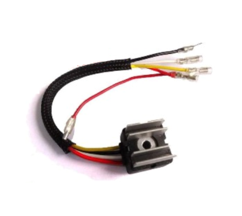 Fios: 1 amarelo Macho; 1 branco Macho; 1 vermelho Fêmea c/ derivação Macho; 1 preto Olhal',